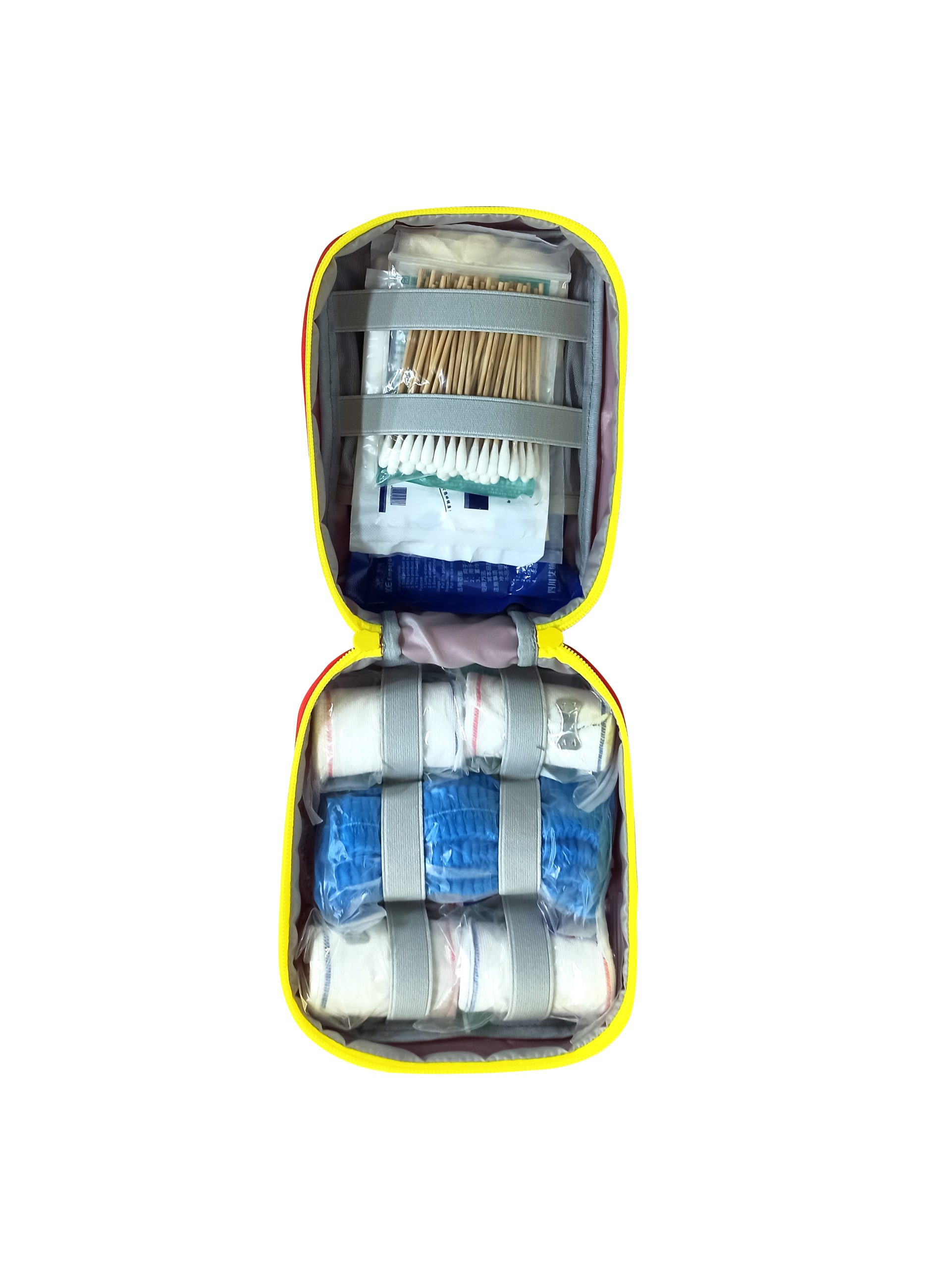 Portable small first aid kit with reflective design, quick-access layout, and multiple inner pockets. Compact yet functional — perfect for travel and outdoor adventures.
