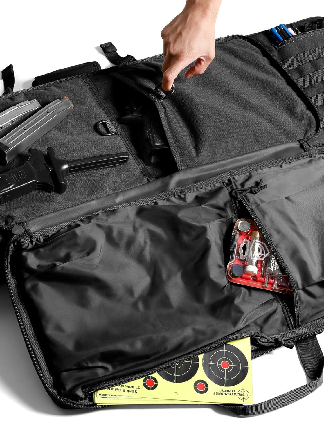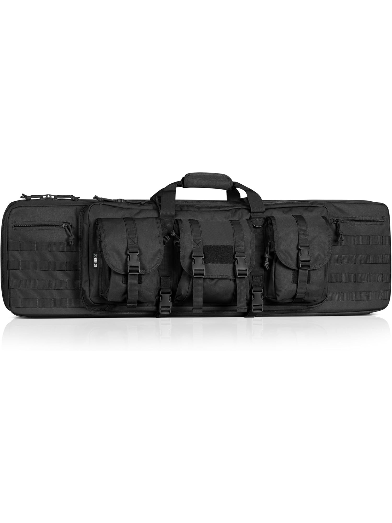 Interior is padded and partitioned to safely hold two rifles or shotguns (available in 36″, 42″, or 48″ lengths). Front includes three waterproof pouches for handguns, magazines, and essentials.