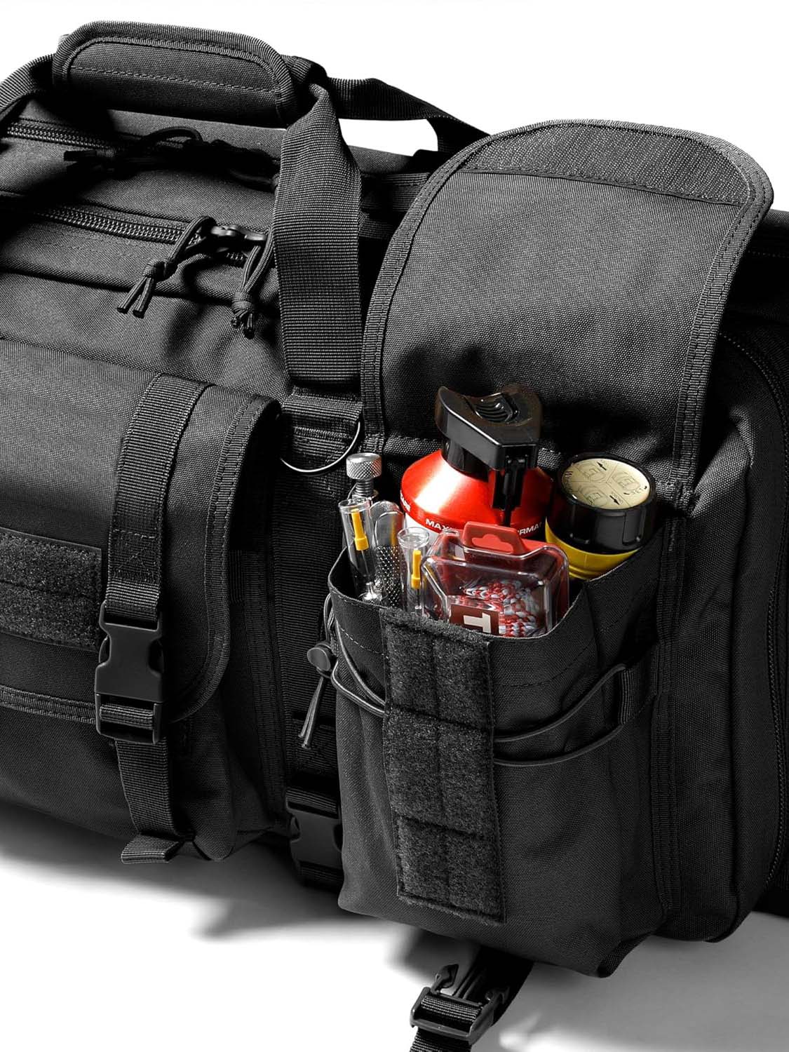 Features lockable zippers for added security during transit. Exterior MOLLE/PALS webbing lets you attach additional pouches, tools, or accessories to expand your loadout.